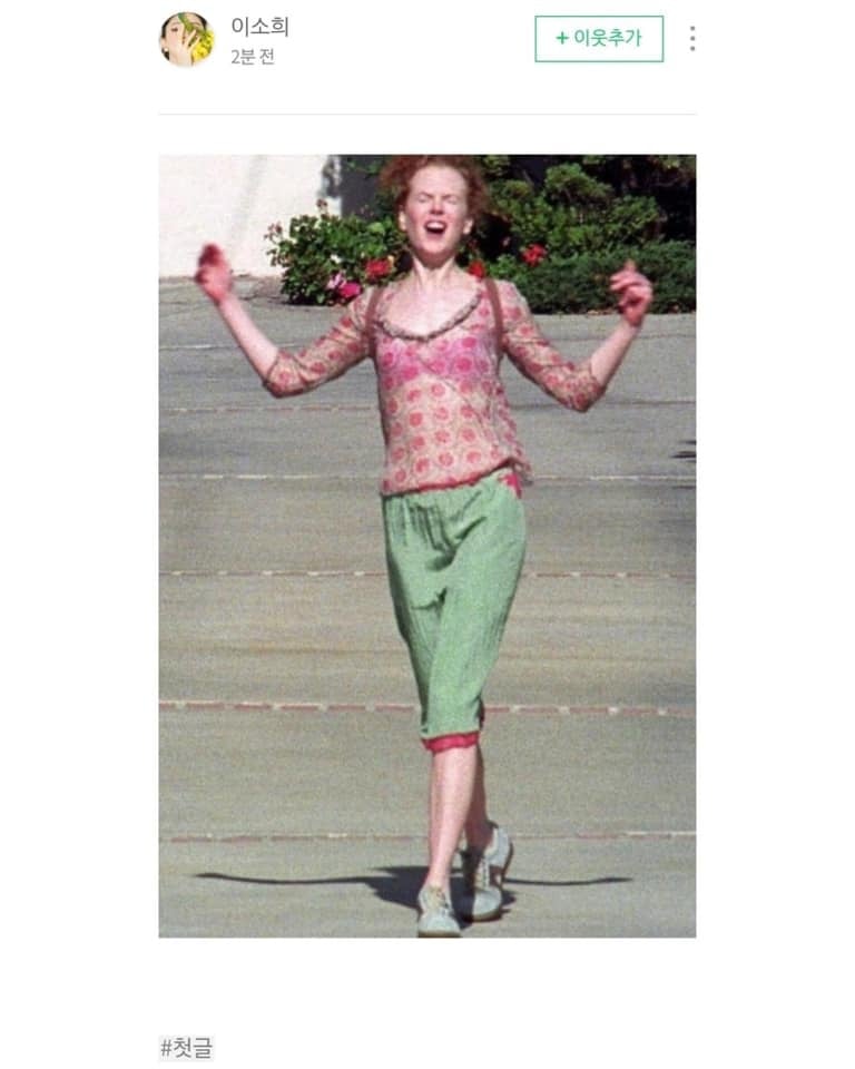 On March 30th, Han So-hee uploaded a photo to her blog without any captions. The photo is Nicole Kidman on the day she successfully divorced Tom Cruise. It’s popular as the ‘Nicole Kidman divorce meme,’ showing Nicole Kidman looking relieved after signing divorce papers.