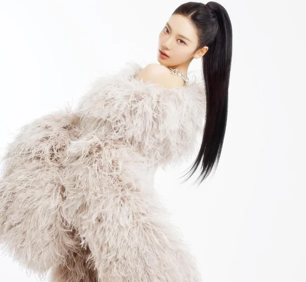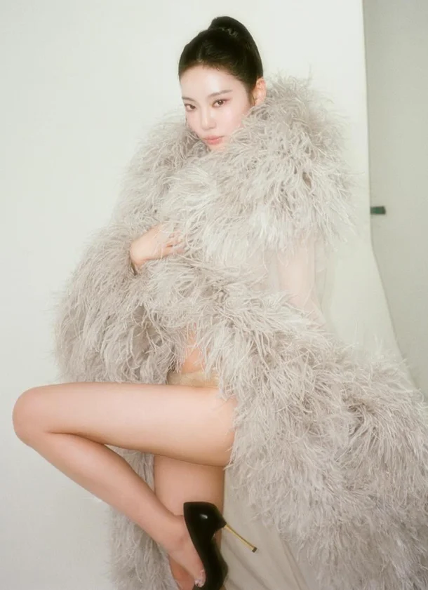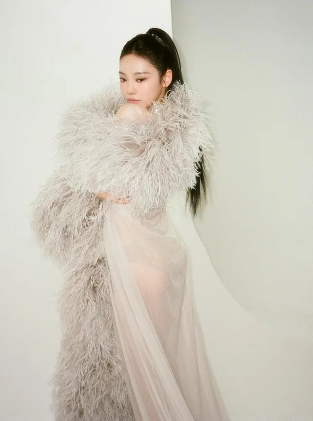 In the released photo, Ningning stood in front of the camera in a grey-toned feather dress with rich volume.
