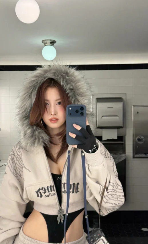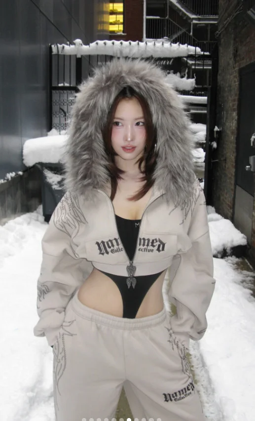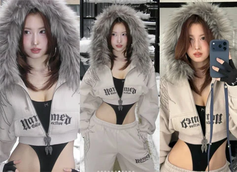 In the picture, Momo is seen posing in an unconventional costume on a snowy street. Momo wore an outerwear to a monokini costume that revealed her pubis, attracting attention by revealing her abs and glamorous body.
