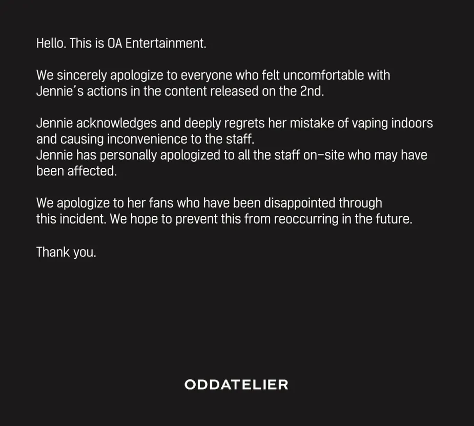 NewsBLACKPINK’s Jennie Addresses Backlash Over Smoking Indoors Last updated: July 9, 2024 3:43 pm ratha Share - Advertisement - The idol is currently under fire.BLACKPINK Jennie‘s label responded to her smoking controversy.JennieOn July 9, Jennie acknowledged and apologized for smoking indoors. According to Xports News, Odd Atelier released a statement. TAGGED:BLACKPINKJennie Share This Article Facebook Copy Link Print Share Previous Article ITZY’s Lia is making a comeback “Significant improvement in anxiety symptoms” Next Article IU Set Up Food Trucks By Professional Chefs To Treat Staff After Japanese Concert You Might Also Like News MEOVV unveils powerful new teaser photos for ‘BURNING UP’ Tola October 5, 2025 News BTS’s V, BLACKPINK’s Jennie, and EXO’s Kai all appear at the same airport on the same day, departing for Paris Fashion Week Tola October 5, 2025 News Following Jang Wonyoung, IU Stuns in Gorgeous Dress After Weight Gain Confession Tola October 4, 2025