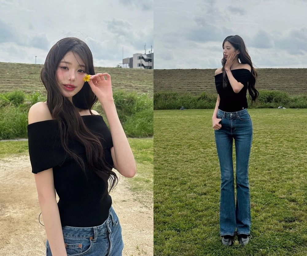 In the photos, Jang Wonyoung strikes a pose in an open field. Wearing a black off-shoulder t-shirt and jeans, she captivated viewers with her slender legs and doll-like appearance.