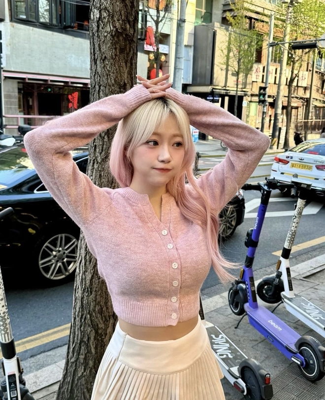 Jeewon steals the spotlight with her vibrant, radiant look in trendy, youthful attire. The 1999-born idol wore a bra top paired with a cut-out camisole and a pleated skirt, accentuating her slim figure and full, seductive bust. Her pink-toned makeup and red lipstick further highlight her striking, eye-catching appearance.