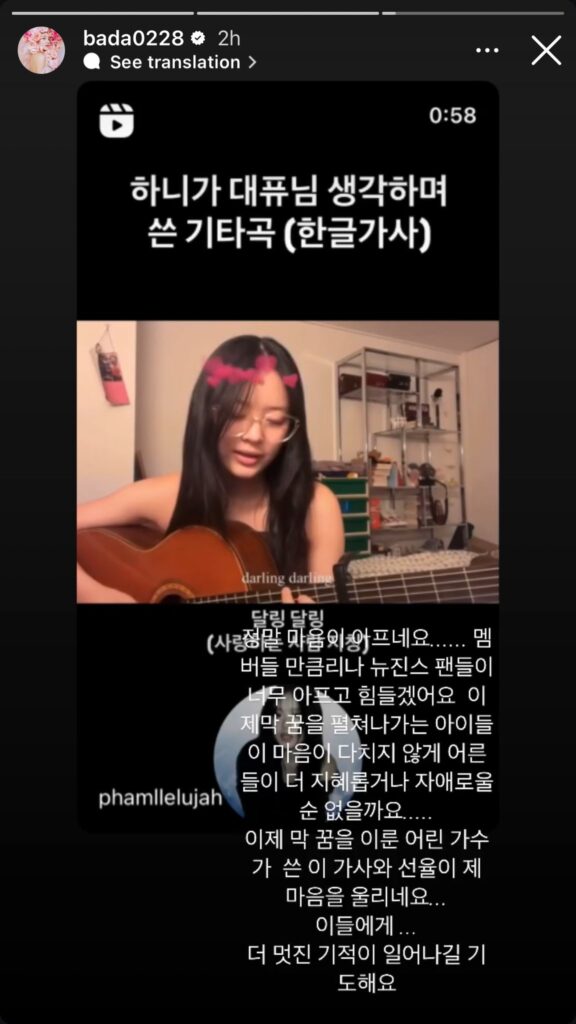 On September 5, former S.E.S member Bada shared a video of NewJeans’ Hanni singing a self-written song on her Instagram story and expressed sympathy for the girl group.
