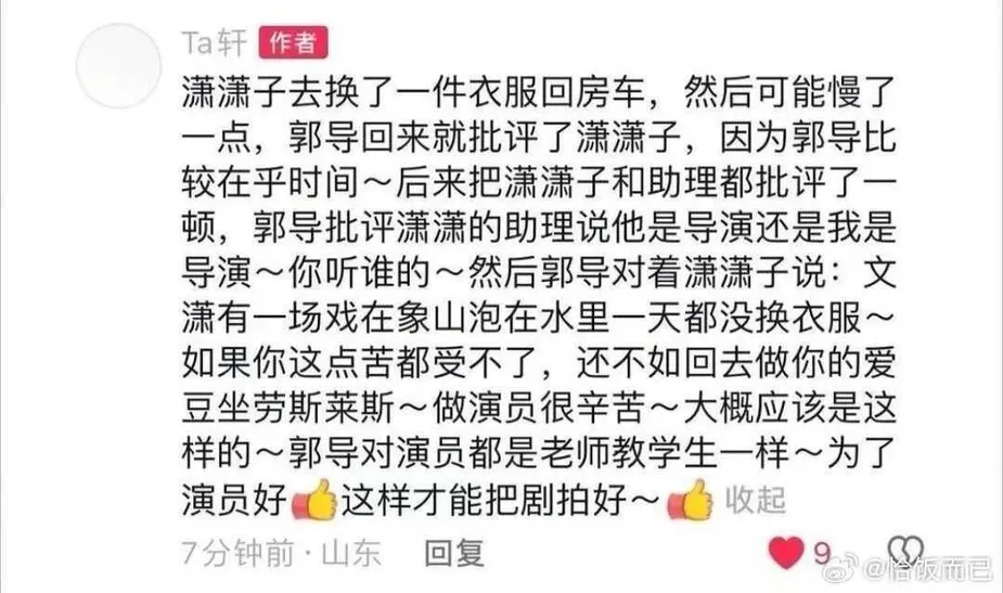 Cheng Xiao went back to the car after changing, but perhaps she was a little bit slow, so Director Guo criticized Cheng Xiao. Director Guo cares a lot about time~ He criticized Cheng Xiao and her assistant. Director Guo criticized Cheng Xiao’s assistant by saying, “Is she the director or am I the director~ Who are you listening to~” Then Director Guo said to Cheng Xiao, “Wen Xiao [character played by Chen Du Ling] had a scene where she was in the water for the whole day in Xiangshan, without changing clothes~ If you can’t take this little bit of suffering, then go back to being an idol and ride in a Rolls Royce~ Being an actor is tough~” It was like that. Director Guo teaches actors as if they have a teacher-student type of relationship~ It’s all for the actors’ own good. This way, the drama comes out well~