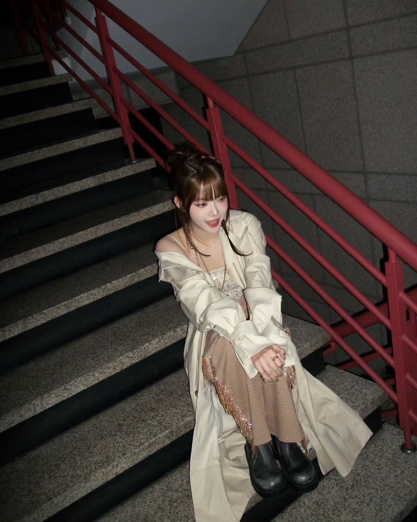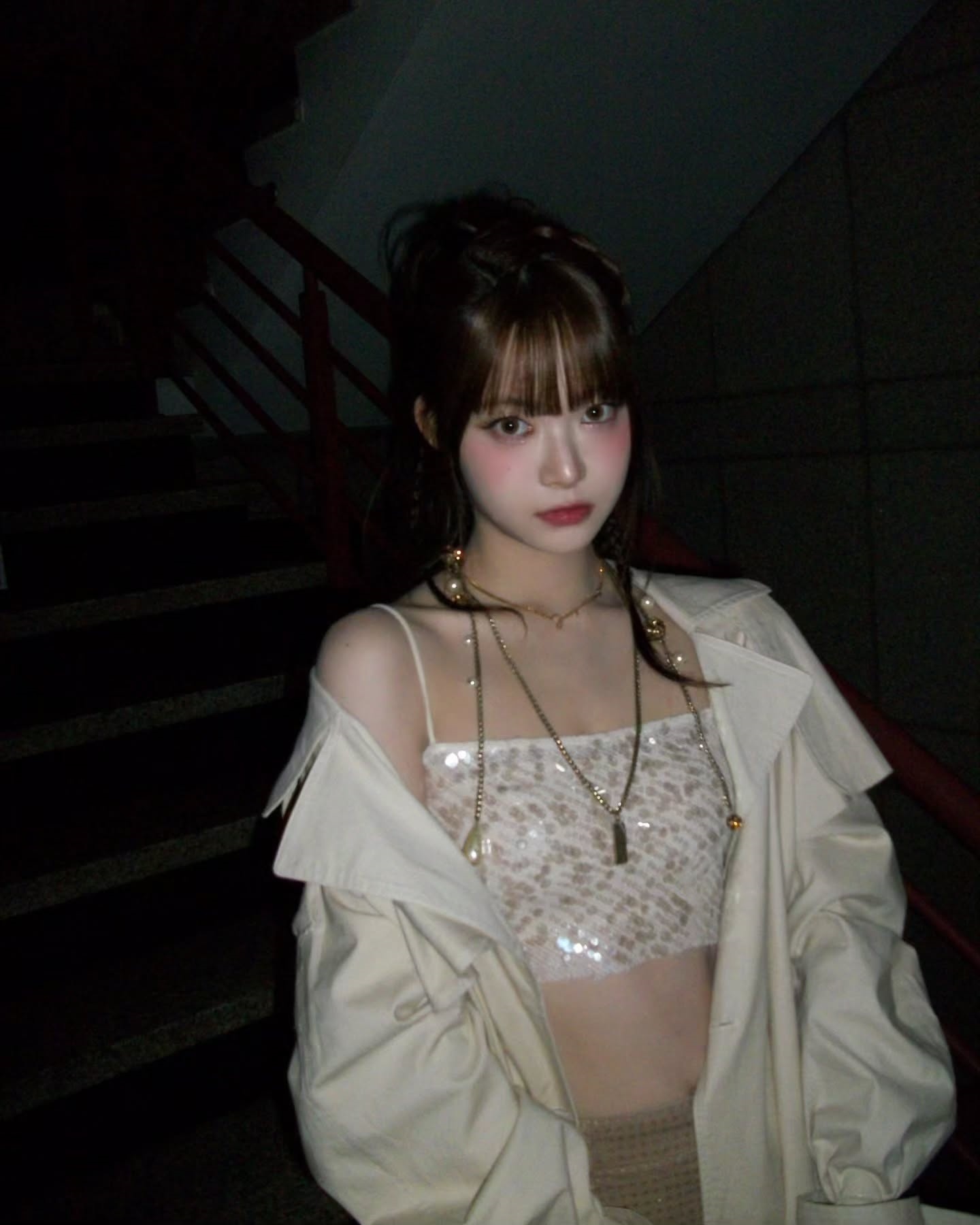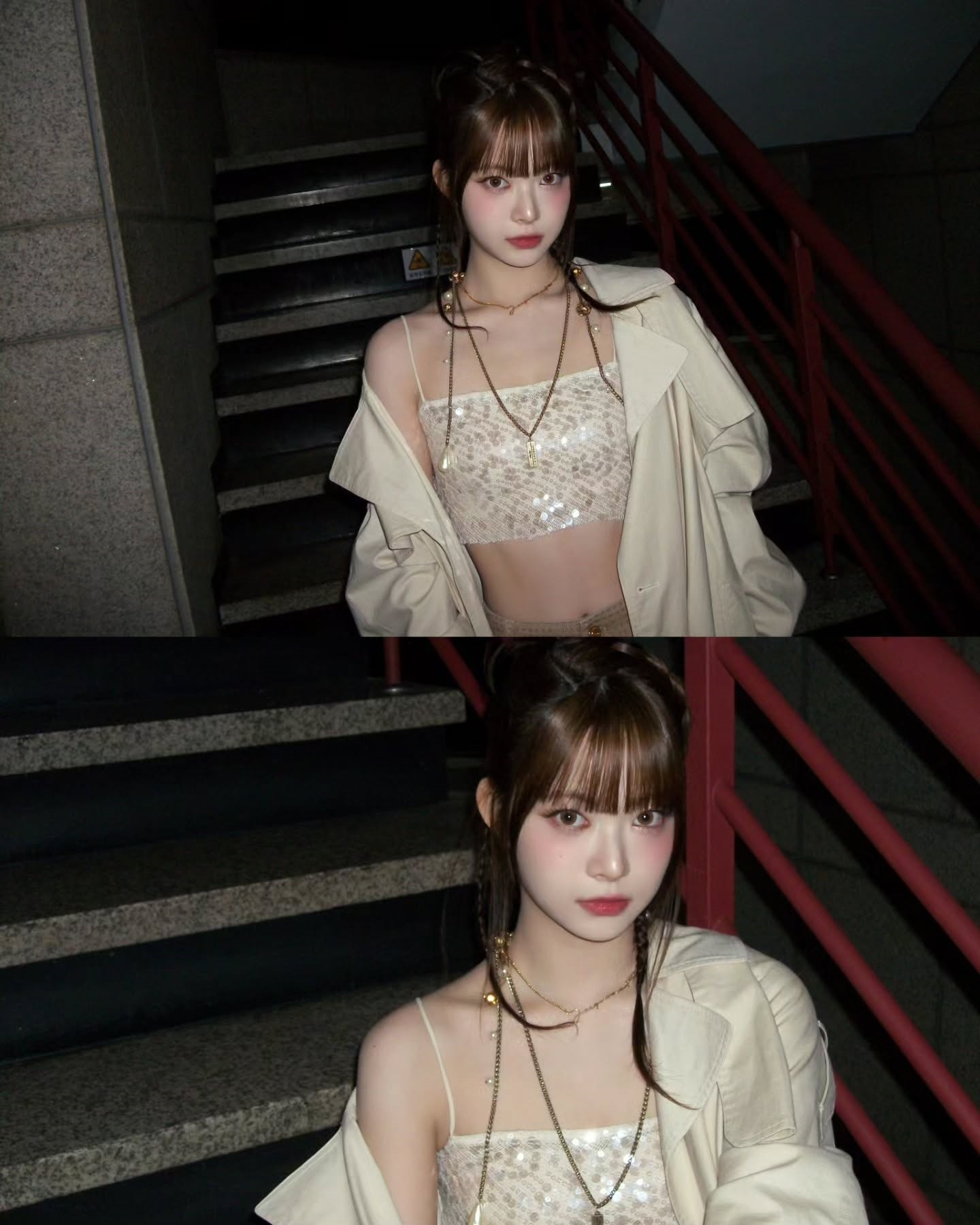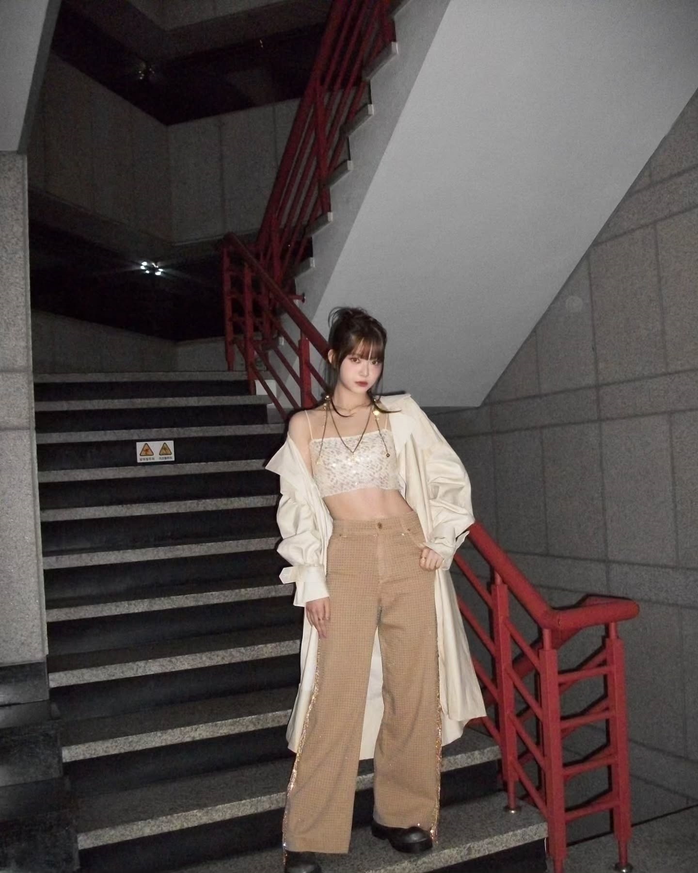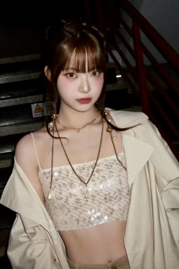 In the picture, Hong Eun-chae is posing with a chic expression while wearing a top that reveals her abs inside the coat that covers her shoulders.