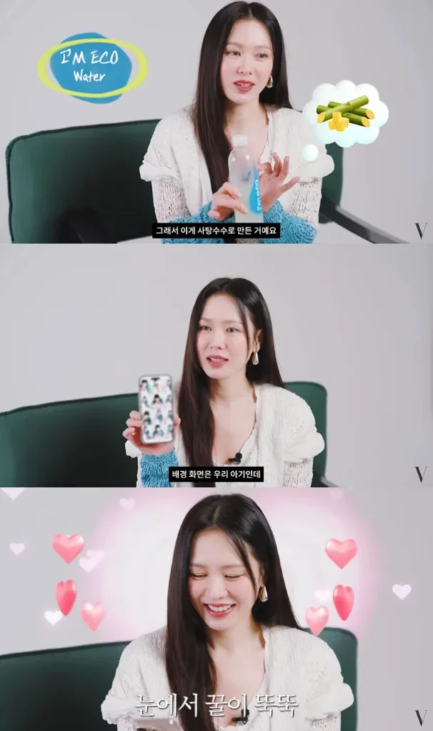 One of the first items she pulled out was bottled mineral water. Holding it, the actress explained, “This isn’t an ad, but as a mom, I wanted to find a water brand that’s free of microplastics for my child.” She went on to say that the eco-friendly bottle, made from sugarcane, makes her feel safer about giving it to her little one.