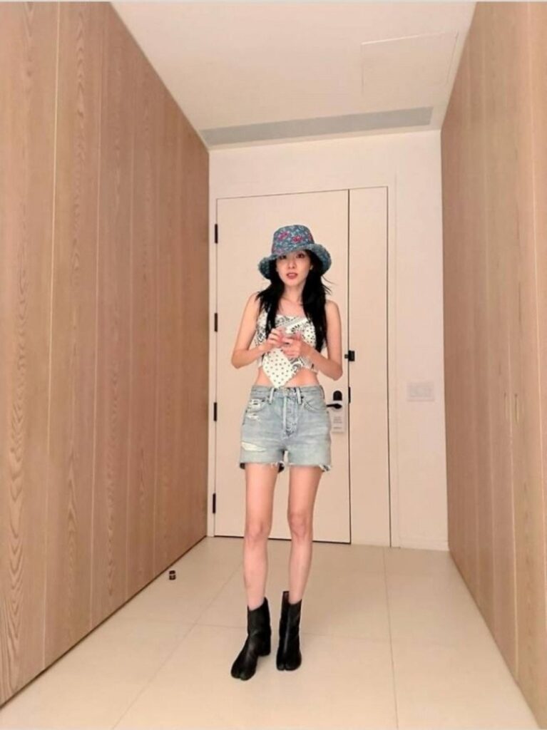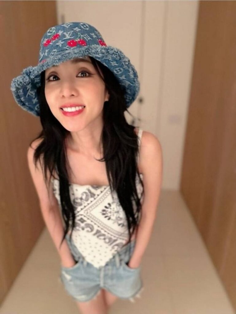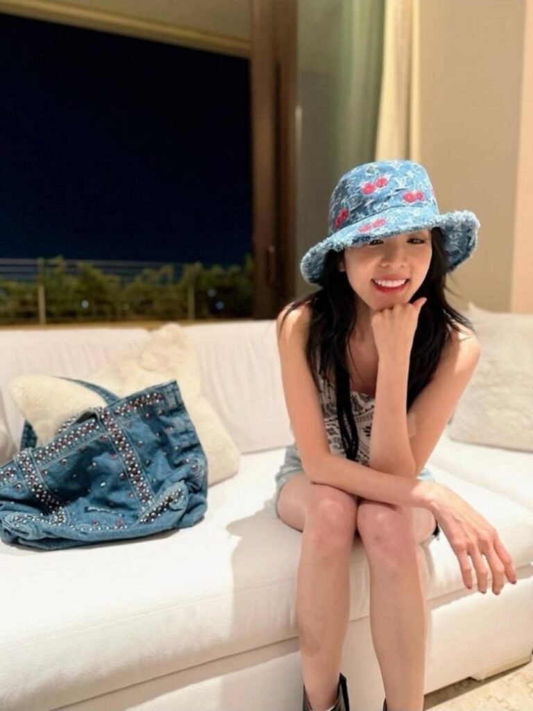 In the newly released images, Sandara smiles brightly at the camera while wearing a Louis Vuitton denim bucket hat featuring playful cherry embroidery. Her outfit includes a white paisley-patterned scarf top paired with light-wash denim shorts, creating a strong Y2K aesthetic. The slightly cropped design of the top adds a bold, carefree touch, highlighting her slim figure and offering a standout example of summer street fashion.