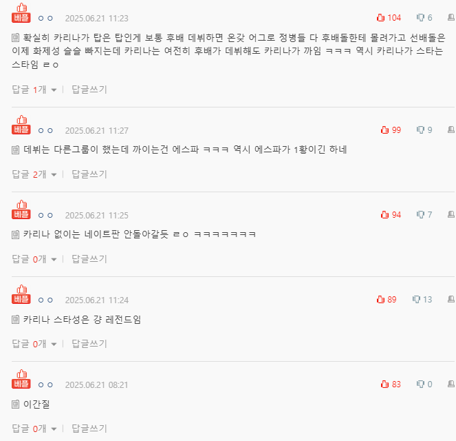 - “You can really tell Karina is still at the top. Normally, when a rookie group debuts, all the trolls and haters swarm the new idols, and the older idols slowly lose buzz. But even when a new group debuts, it’s Karina who gets hate instead of them, lol. That just proves Karina’s a real star. Seriously.”