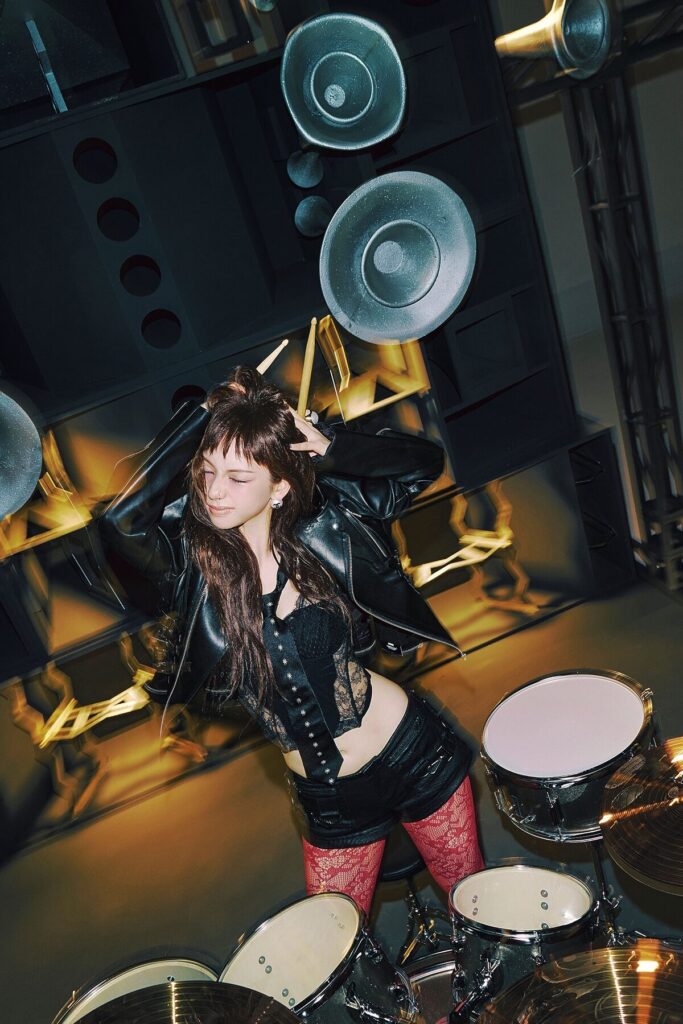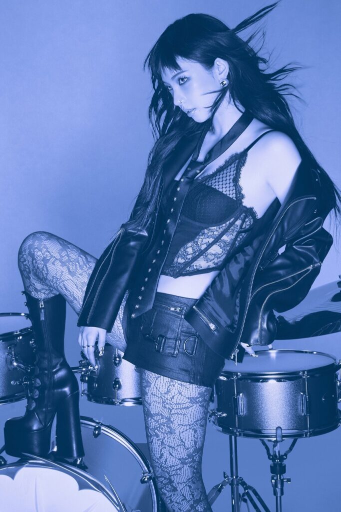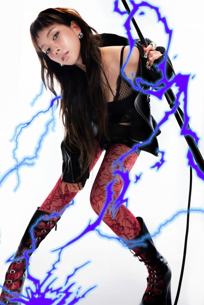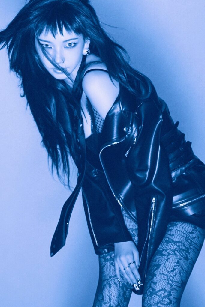 Karina emerged with a brand new look, including choppy bangs, blue eyes, and an edgy outfit.