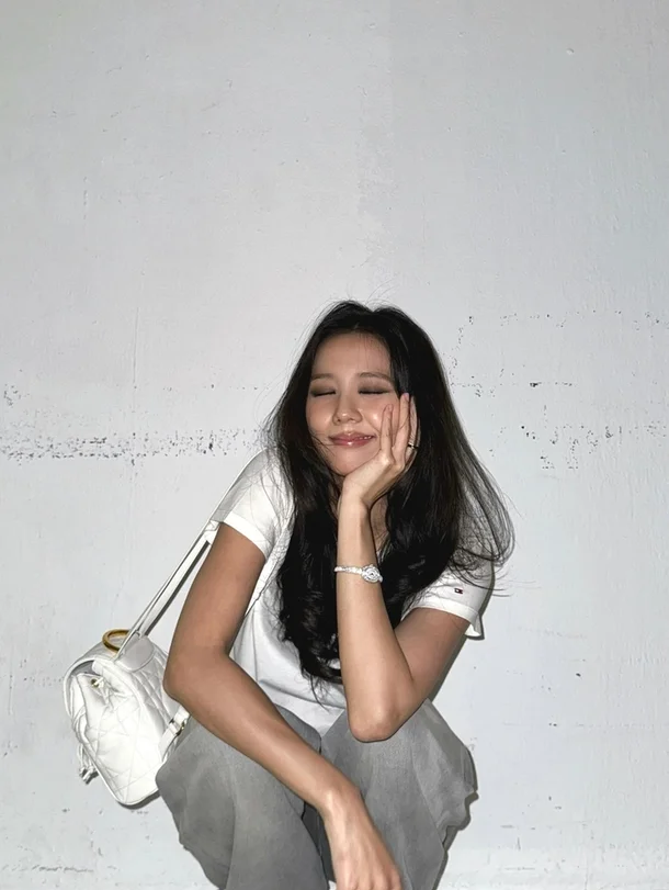 In the released photo, Jisoo matches a white short-sleeved T-shirt with light grey wide pants to show a comfortable and stylish look.