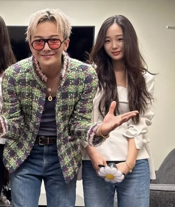 Lee Joo-young posted a photo of herself with G-Dragon on her account on Tuesday. In the photo released, Lee holds an official cheering stick shaped like a daisy flower in her hand as if she attended a G-Dragon concert. G-Dragon stood in front of the camera in his signature relaxed manner.