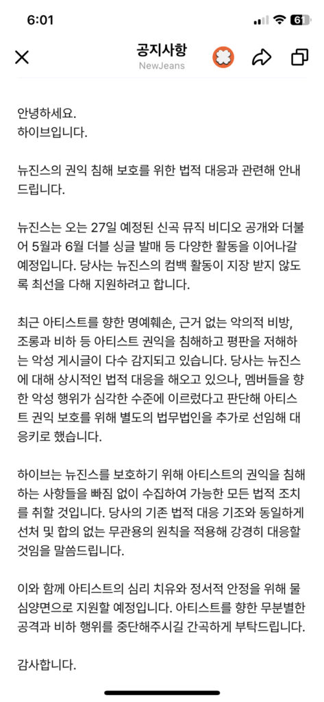 Recently, many malicious articles infringing upon the rights, interests, and damaging the reputation of artists, including defamation, groundless slander, mockery, and derogation, have been discovered. We have been taking legal actions regularly (against violators) regarding NewJeans, but we have noticed that the malicious behaviors targeting the members have reached a serious level, so we have decided to appoint an additional law firm to respond to protect the rights and interests of the artists.