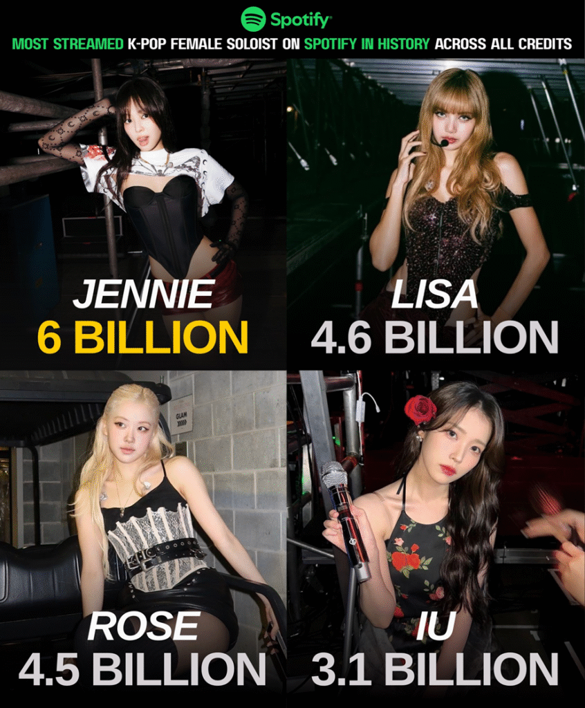 Jennie has surpassed 6 Billion streams on Spotify across all credits, becoming the “First and only K-pop Female Soloist to achieve this figure”. With this incredible achievement, Jennie has also just joined BLACKPINK, TWICE and NewJeans as the only Female K-pop Act to reach this mark, thus consolidating her global impact and the public’s preference for her acclaimed music.