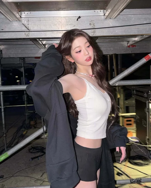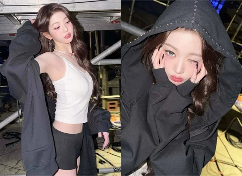 In the picture, Jang Wonyoung is wearing a hooded t-shirt in fashion with a white slip sleeveless top and black shorts. Jang Wonyoung, who has a juicy expression as if she is winking with one eye closed, draws attention by even emitting sexiness.