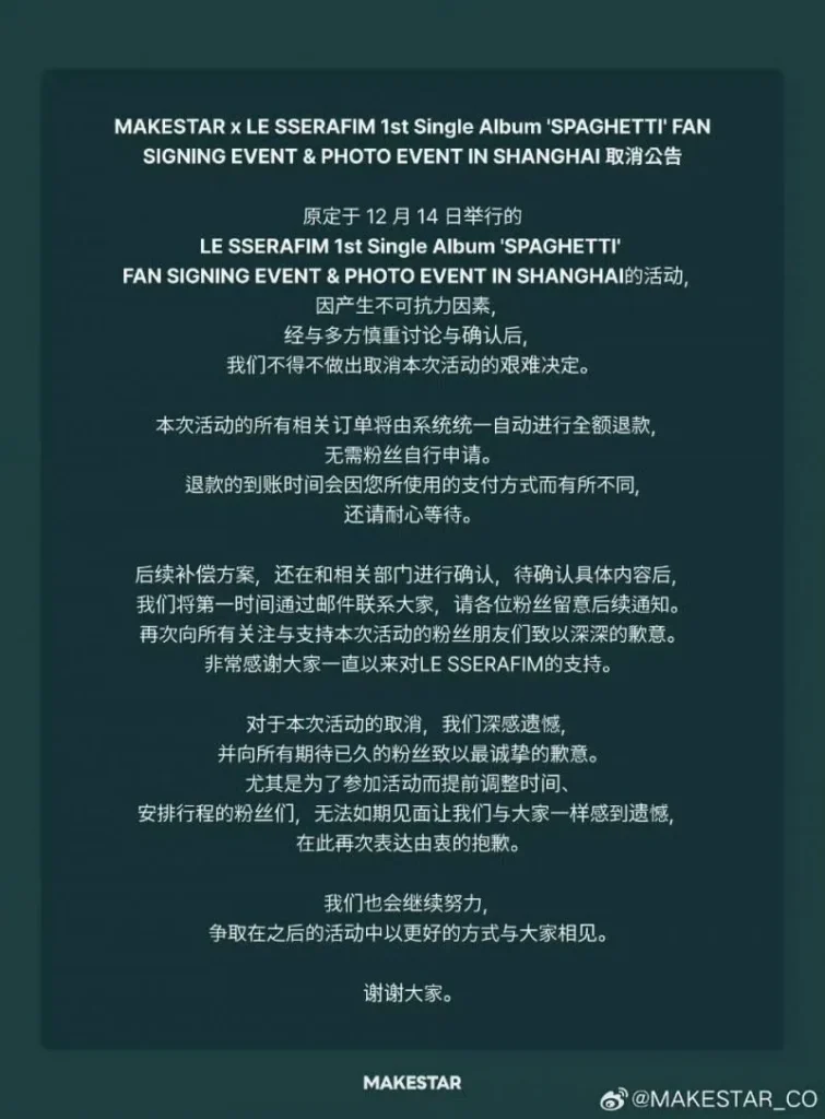 On December 12, Chinese fans were stunned by the abrupt announcement that LE SSERAFIM’s highly anticipated Shanghai fan sign event, originally scheduled for December 14, had been canceled only 48 hours in advance. The decision was announced by event organizer Makestar via Weibo, citing “uncontrollable circumstances” as the reason behind the cancellation.