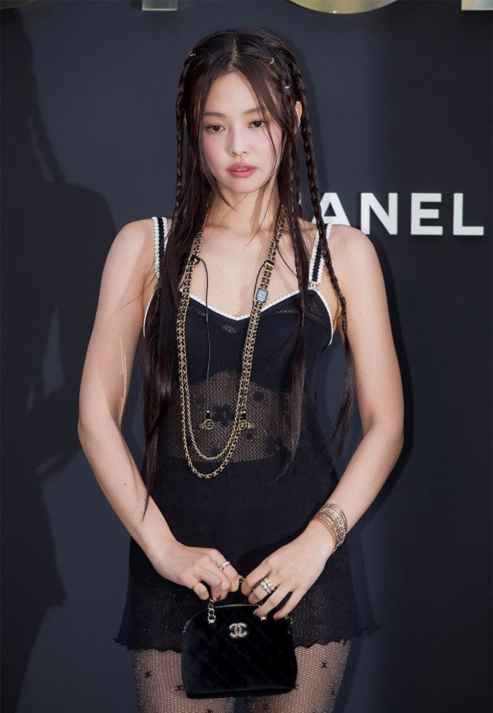 Jennie paired a black mini see-through dress that revealed her underwear with black see-through stockings, exuding a sexy yet lovely charm. She completed the look with reggae hair, a nose piercing and bold accessories, adding a hip vibe.
