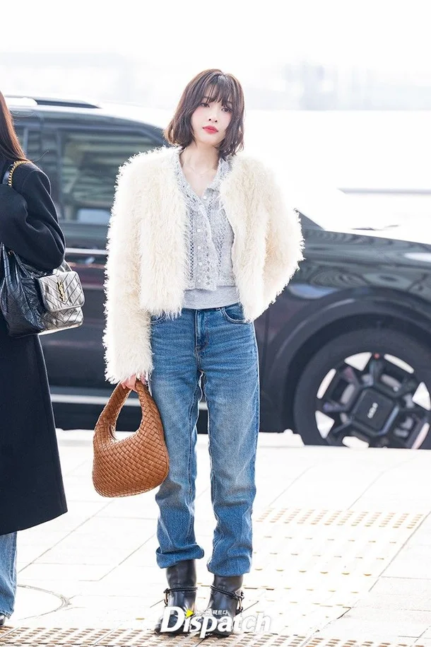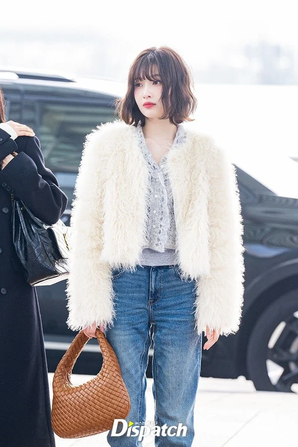 Joy dressed up in a white fur jacket and denim pants. She greeted her with a fresh look.
