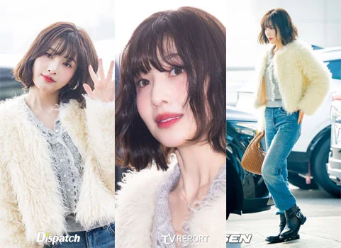 Joy dressed up in a white fur jacket and denim pants. She greeted her with a fresh look.