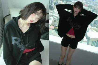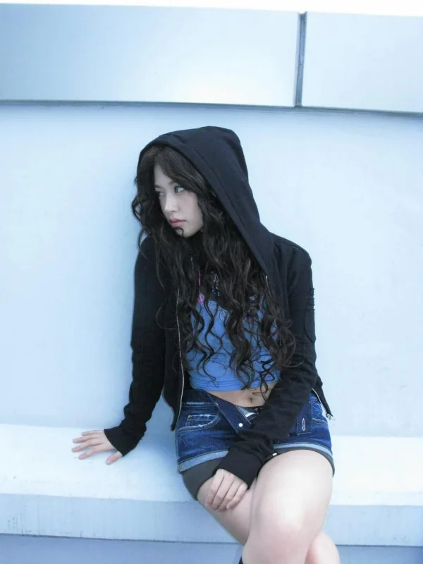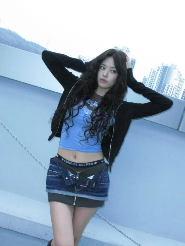 What drew attention in particular was Yu-jin’s unconventional fashion. She showed off her solid abs by matching a blue cropped t-shirt with a black hooded zip-up. On top of that, she added a dizzying sexiness by showing the underwear line between the denim skirt worn across the pelvis.