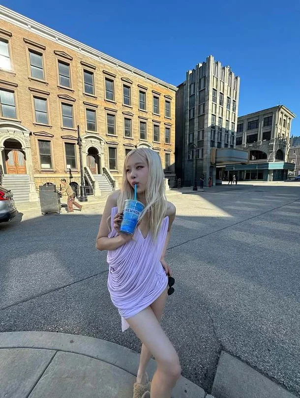 Rosé is posing in an ultra-mini dress. She appears to be filming. Blonde Rosé showed off her unique angular beauty and lines with a cold cup in her hand.